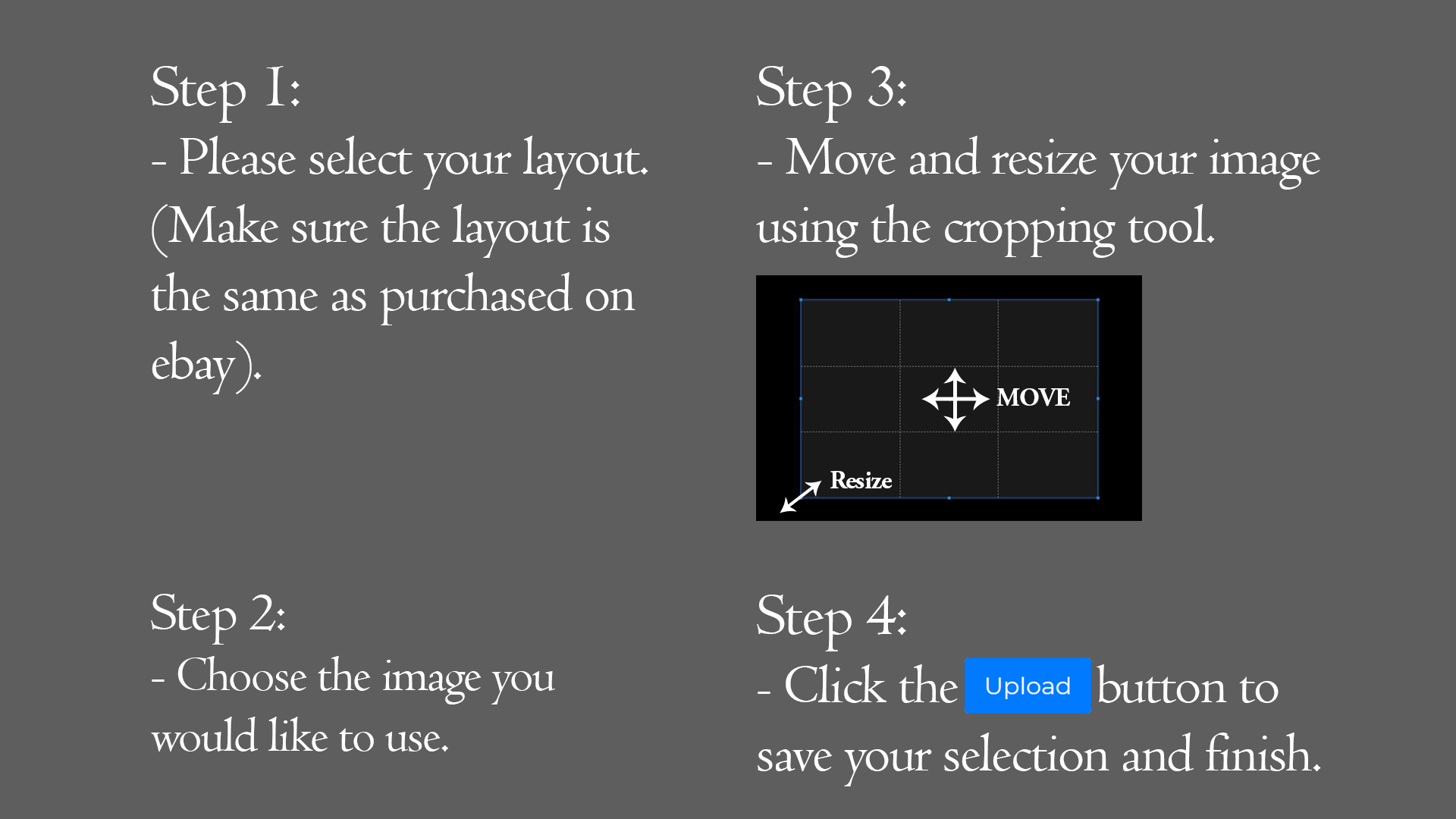 To proceed, please enter the details above alongside your eBay ID (this is your eBay name, not the product ID). Please ensure that the orientation in the next step matches that of the item purchased. (I.e. if you have purchased landscape/horizontal make sure to choose this same layout in the layout section). We use the latest printing technology, print quality is directly related to the quality of the image provided, images taken from social media, WhatsApp or screenshots from phones are usually of reduced quality. We are not responsible for any dissatisfaction caused by this.